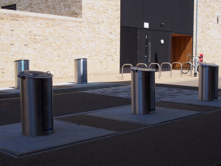 Efficient recycling: the bins empty into underground receptacles, demarcated by the white squares on the ground. The whole thing lifts out to be emptied.